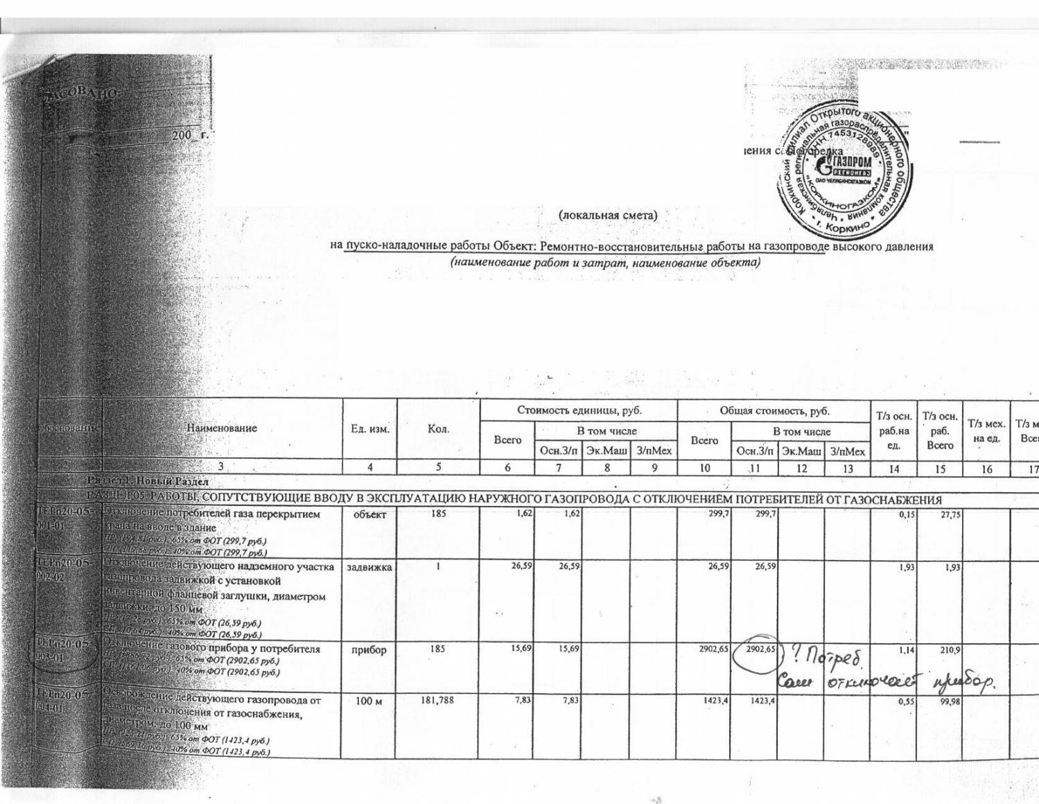 Уважаемый Тюленин, меня очень смущают все те работы которые предъявляет Газпром. Ведь разрыв произошел на газопроводе высокого давления, а ПНР они берут на газопроводы низкого давления (у потребителей) и отключение, включение ГРП, ШРП, заменили участок трубы 200мм 30метров, а ПНР берут на 287м.