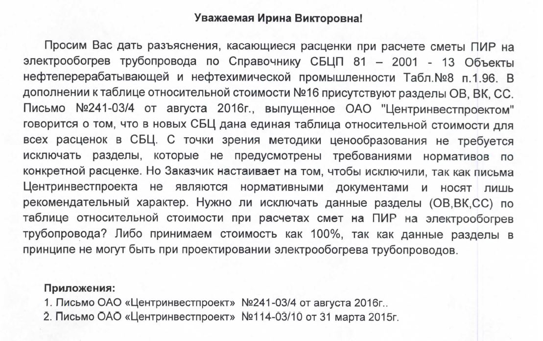 Добрый день. Сегодня у меня с Заказчиком состоялся долгий спор о том, Заказчик утверждает, что конктрено на обогрев п.1,96 надо исключать согласно табл. относительной стоимости разделы ОВ, ВК и СС. Я долго доказывала, что обогрев в принципе не предусматривает такие разделы и ссылалась как раз на это письмо Центринвеста. Но мне прислали другое письмо (вложение), где прописано о статусе консультаций Центринвеста... То есть получается, что все, что пишет Центринвест в своих письмах и консультациях не несет никакой силы? Тогда зачем нужны эти консультации и разъяснения, если они бессильны перед Заказчиком? Может быть есть какое-то другое письмо где сказано, что имеет силу то все таки?))
