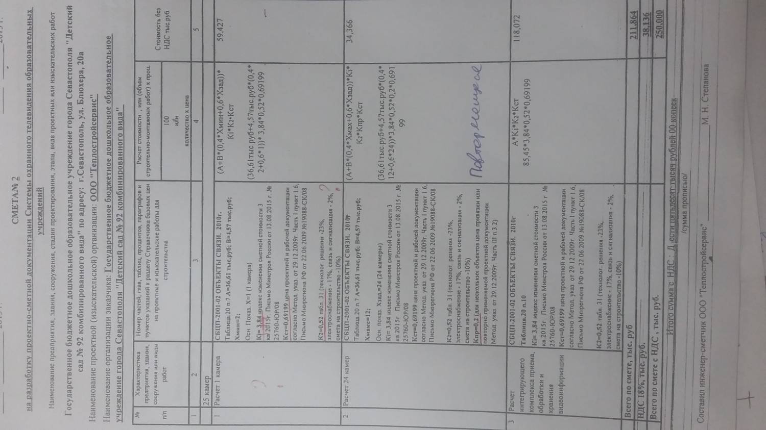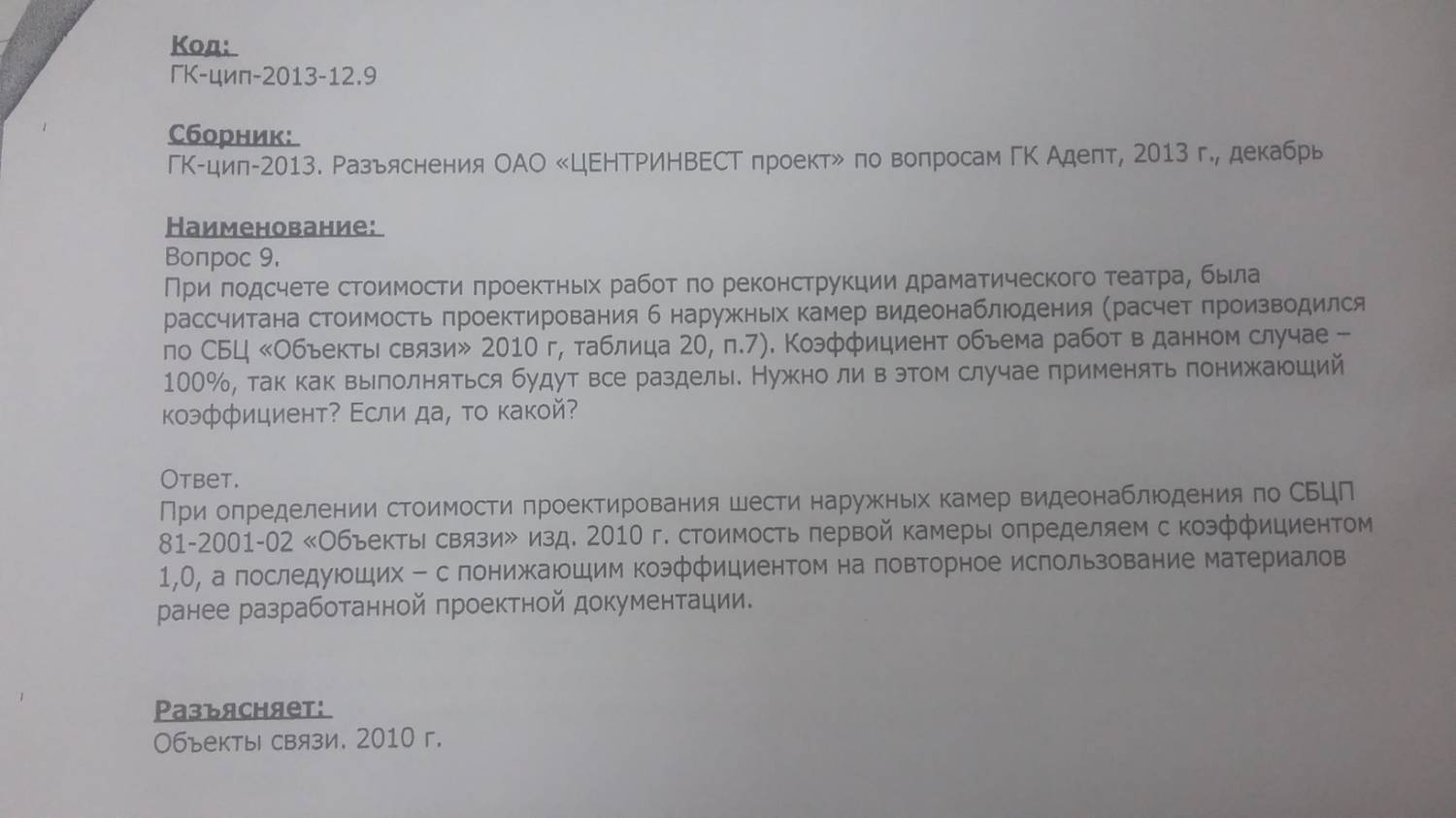 Уважаемые сметчики, добрый день. У меня вот такой вопрос. Работаю в Севастополе. Есть у нас Государственное бюджетное учреждение "Севастопольский центр сметного нормирования и ценообразования в строительстве". Отдали на экспертизу смету на проект установки видеонаблюдения, 24 камеры. (смету прилагаю.) на что нам сказали, что все не правильно и что надо считать по другому (фото их "правильной" сметы прилагаю).Утверждают ,что надо применять коэффициент 0,2. как для типовых проектов.(но ведь камеры все в одном индивидуальном проекте,) Ссылаются на разъяснения сборника ЦИП - 2013. (фото прилагаю). Подскажите, насколько правильно так считать?
