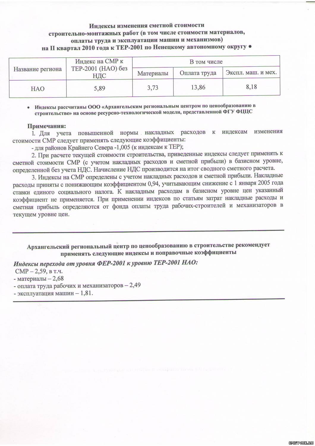 1.Предельно допустимые индексы пересчёта сметной стоимости на 3 квартал 2010 года к элементам прямых затрат территориальных сборников единичных расценок на строительные (ТЕР-2001), монтажные (ТЕРм-2001), ремонтно-строительные (ТЕРр-2001) и пусконаладочные работы (ТЕРп-2001), утвержденных на территории Ямало-Ненецкого автономного округа, рассчитаны к базисному уровню цен на 01.01.2000г. года предназначены для расчетов стоимости строительства базисно-индексным методом, формирования начальной цены при подготовке конкурсной документации, действительны до опубликования новых. 2. Для строек, финансирование которых осуществляется за счет внебюджетных средств, индексы удорожания к элементам прямых затрат носят рекомендательный характер. 3. Пересчет базисной стоимости объектов капитального строительства в текущий уровень цен с применением индексов производится по элементам структуры прямых затрат (оплата труда, эксплуатация строительных машин и механизмов, материальные ресурсы в составе единичных расценок) по видам строительно-монтажных работ путем перемножения элементов затрат с последующим суммированием итогов по соответствующим графам сметного документа. При этом для пересчета стоимости эксплуатации машин в соответствующий уровень цен применяется индекс на эксплуатацию машин, а к оплате труда механизаторов, входящей в стоимость эксплуатации машин, индекс на оплату труда с последующим начислением накладных расходов и сметной прибыли. 4. При формировании индекса на оплату труда в составе прямых затрат территориальных сборников единичных расценок ТЕР-2001 ЯНАО расчет оплаты труда выполнен на основе «Федерального отраслевого тарифного соглашения по строительству и промышленности строительных материалов Российской Федерации» от прожиточного минимума для трудоспособного населения, утвержденного постановлением Губернатора Ямало-Ненецкого автономного округа, который соответствует месячной тарифной ставке рабочего 1 разряда при работе в нормальных условиях труда, отработавших полностью месячную норму рабочего времени и выполнивших нормы труда. Индексом пересчета оплаты труда не учтены выплаты компенсационного и стимулирующего характера. 5. Районный коэффициент и льготы Крайнего Севера начисляются к оплате труда рабочих строителей и механизаторов при формировании сметной стоимости в составе оплаты труда в локальных сметах на основе исходных данных, предоставленных заказчиком-застройщиком разработчику проектно-сметной документации.6. Накладные расходы в текущем уровне цен определяются в соответствии с Методическими указаниями по определению величины накладных расходов в строительстве, осуществляемом в районах Крайнего Севера и местностях, приравненных к ним МДС 81–34.2001 (Госстрой России от 12.01.2004 года №5) от величины средств на оплату труда рабочих (строителей и механизаторов). 7. Сметная прибыль в текущем уровне цен определяется в соответствии с положением Методических указаний по определению величины сметной прибыли в строительстве МДС 81-25.2001.