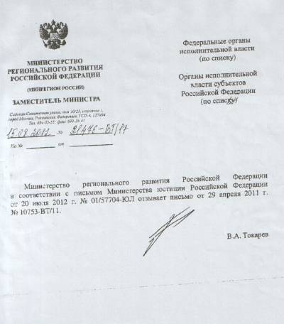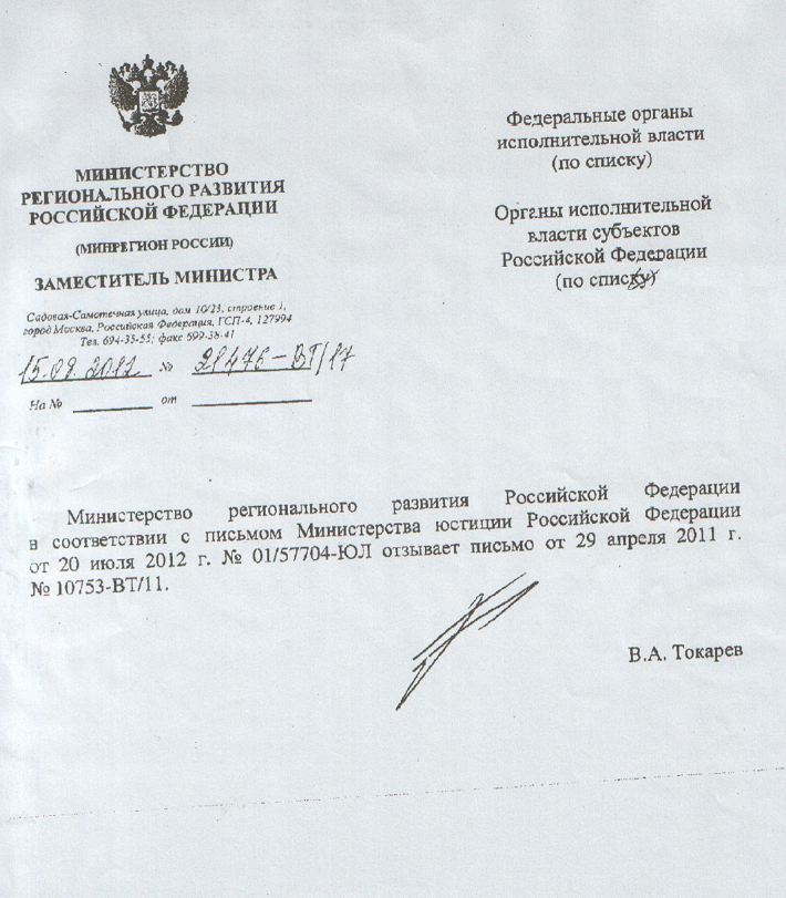 Сначала в письме № 21476-ВТ/17 от 15.08.2012 сказано следующее: «Министерство регионального развития Российской Федерации в соответствии с письмом Министерства юстиции Российской Федерации от 20 июля 2012 г. отзывает письмо от 29 апреля 2011 г. № 10753-ВТ/11.»