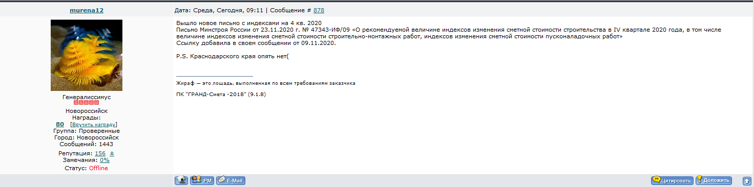 Вышло новое письмо с индексами на 4 кв. 2020 Письмо Минстроя России от 23.11.2020 г. № 47343-ИФ/09 «О рекомендуемой величине индексов изменения сметной стоимости строительства в IV квартале 2020 года, в том числе величине индексов изменения сметной стоимости строительно-монтажных работ, индексов изменения сметной стоимости пусконаладочных работ» Ссылку добавила в своем сообщении от 09.11.2020.