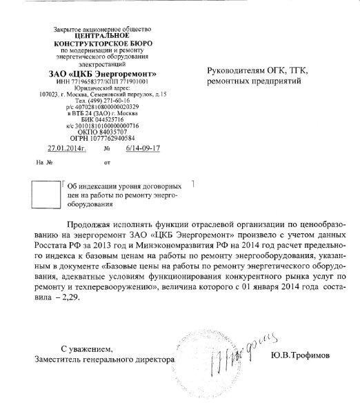 Я звонил в ЗАО ЦКБ Энергоремонт, смог выяснить только что Индексы вышли на прошлой неделе. Значение или номер письма мне отказались сообщить, сказали: "сначала плати 2000 плюс НДС". Но моя контора это оплачивать не станет: пока оплату согласуют, платеж проведут - тендер уже закончится. Так что буду использовать 2013 год.