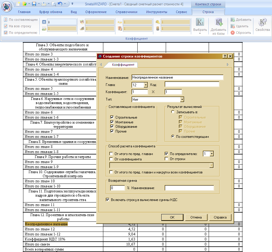 VG, как вариант вам необходимо встать на Итого по главам 1-9, в ленточном меню программы выбрать "Контекст строки". В этой ленте в поле "Определитель" задайте число, например 1. Далее в 12-й главе создайте строку "Коэффициент", в настройках которой необходимо установить опцию "По определителю" 1.