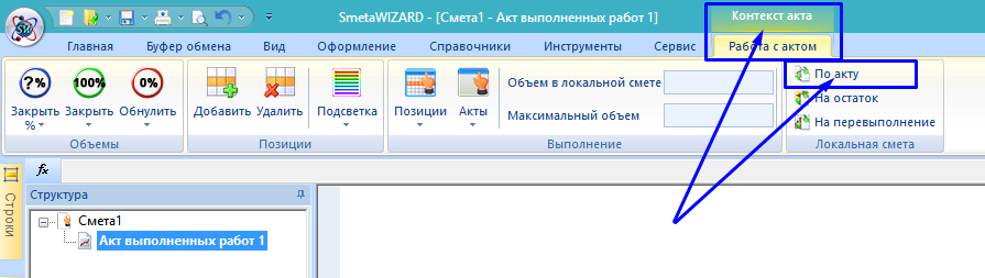 shiganovig, находясь на форме акта выполненных работ необходимо выбрать в меню лент закладку "Контекст акта" и в группе "Локальная смета" нажать кнопку "По акту".