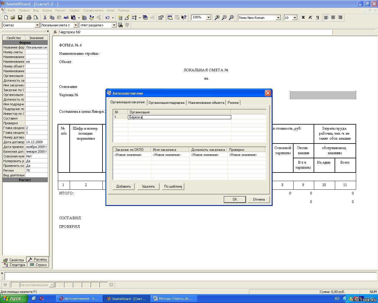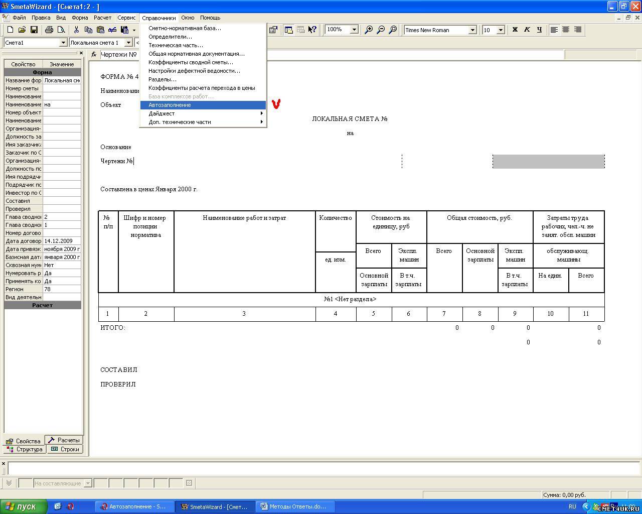 То есть ещё раз по пунктам. 1. В "автозаполнении" Вы заполнили, что нужно. 2. Открыли смету, сводную или объектную. Только если таковых нет, открыли локальную смету. 3. Встали на любой расчёт сметы. 4. Открыли "Свойства", "Форма". Внимание - в конструкторе документа автозаполнение не работает. Только в "Свойства" - "Форма". 5. Начали набирать реквизиты, начиная именно с тех букв и слов, которые внесли в "Автозаполнение". 6. Если ничего не вывалилось - Вам нужно в незабвенный визардсофт, чтобы они всё корректно прописали и/или сказали Вашему админу, что нужно сделать в системных полномочиях.