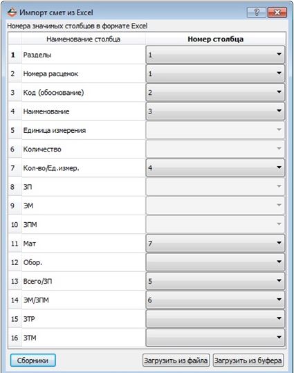 Добавлена возможность загрузки расценок изExcelсо статьями затрат. После выбора «Расценка» -> «Загрузить из Ехcel» появится окно, в котором теперь можно задать номерастолбцов со статьями затрат для расценок, загружаемых из Excel.