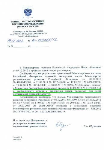 В том самом письме Минюста от 13.09.2012 № 01/75002-ЮЛ было четко сказано о необходимости отзыва с исполнения писем Минрегиона.