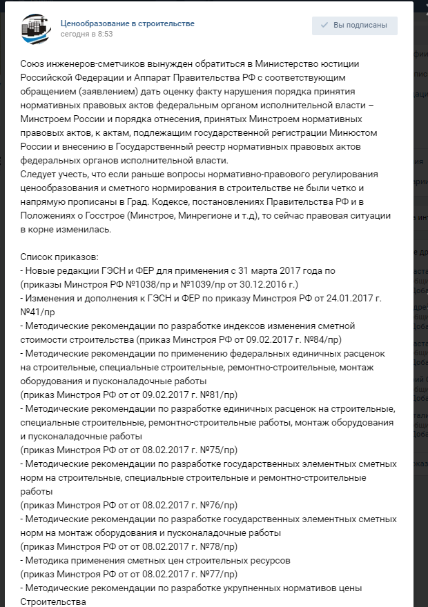 Что же касается общественного обсуждения, которое было прописано в отмененном порядке, то это просто обман. На примере выпуска «актуализированной» сметно-нормативной базы ФСНБ-400 мы были свидетелями полного отсутствия реального публичного обсуждения. Проекты не были опубликованы ни на сайте Минстроя, ни ФЦЦС, ни на regulation.gov.ru. ФСНБ-400 втихаря утвердили, да еще и с подписанием приказов об утверждении ФСНБ-400 замминистром накосячили.