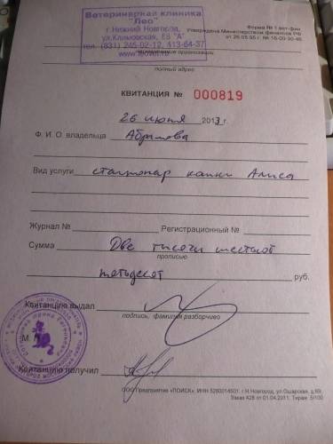 Поправила первый пост. Была сегодня в клинике. Нашу Алису вымыли, удалили блох Сделали рентген - ура!!!! переломов нет!!! Нет ни одного! За сегодня собрали 3500 руб. Все денежки внесла в оплату. Чеки прикладываю. Спасибо всем форумчанам, принявшим участие!!! Спасибо моим сотрудникам!!! Соседям дома 12б по ул.Грузинская! Также хочу поблагодарить Светлану, оплатившую такси до стационара!