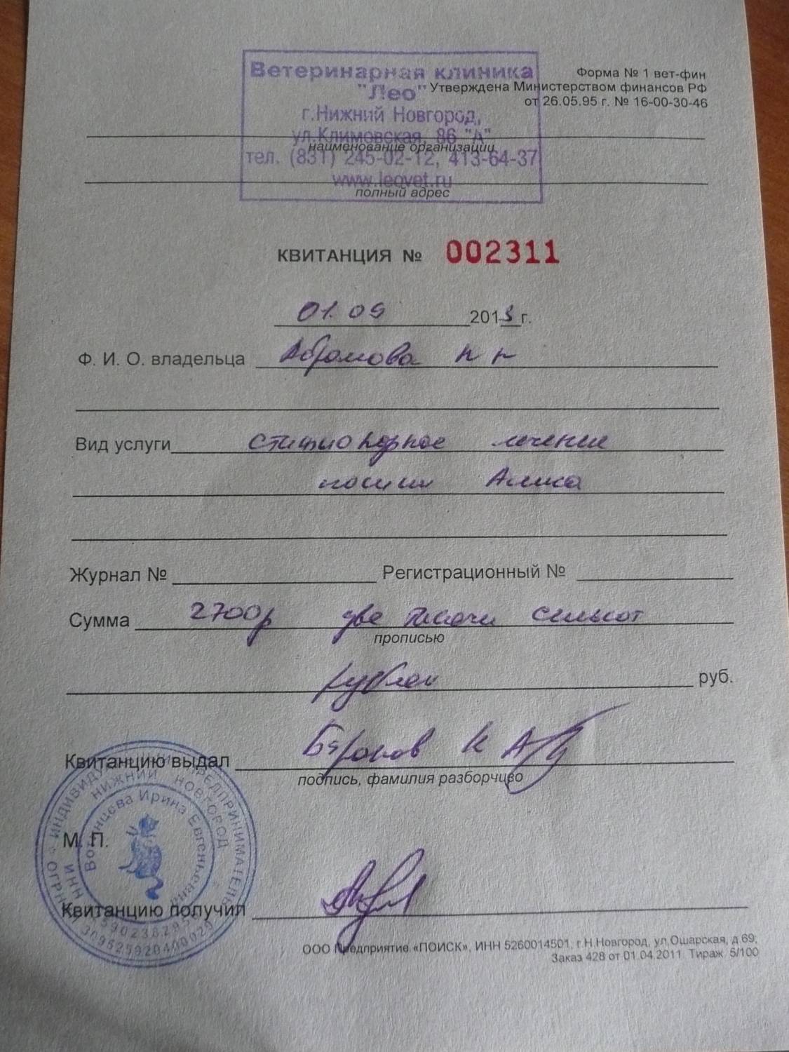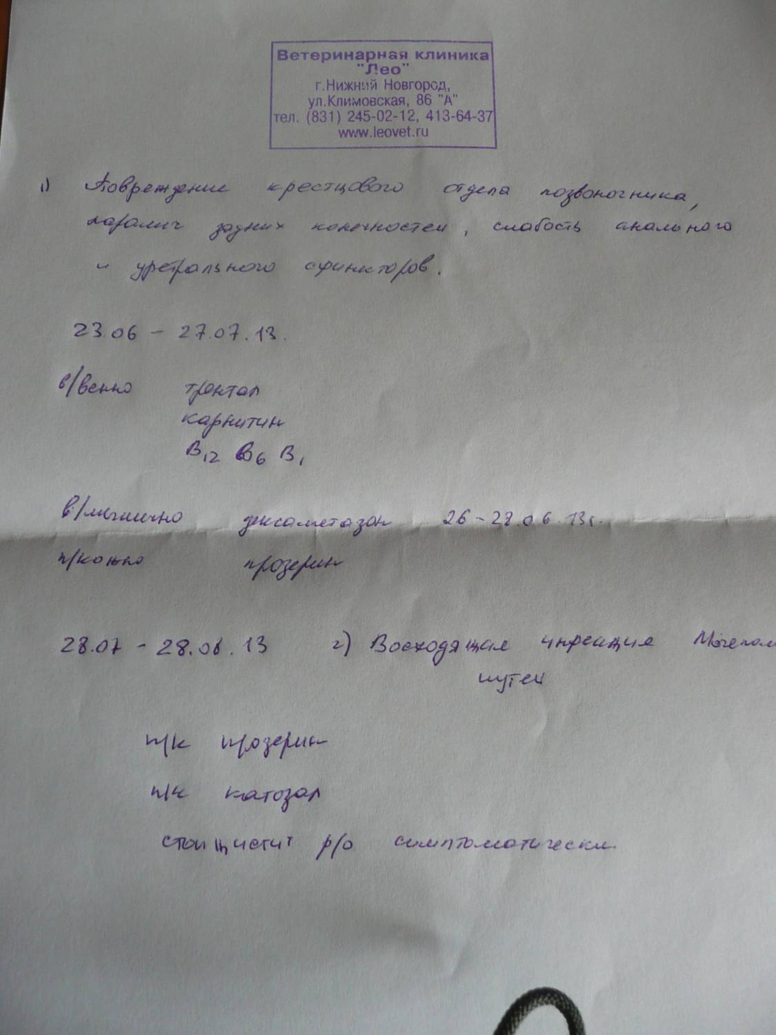 Добавлено (23.08.2013, 21:01) --------------------------------------------- Mursik, да, денежку продолжаю собирать, т.к. лежать нам в стационаре еще и лежать. Лечиться и лечиться Выписку постараюсь "заказать" заранее перед визитом в клинику, а то по факту моего появления там всегда бывают посетители с больными животинками и перехватить врача довольно сложно. Так что как получу выписку, сразу выложу
