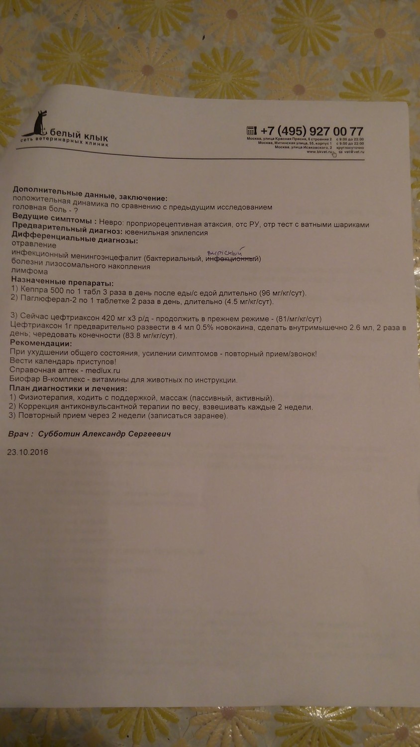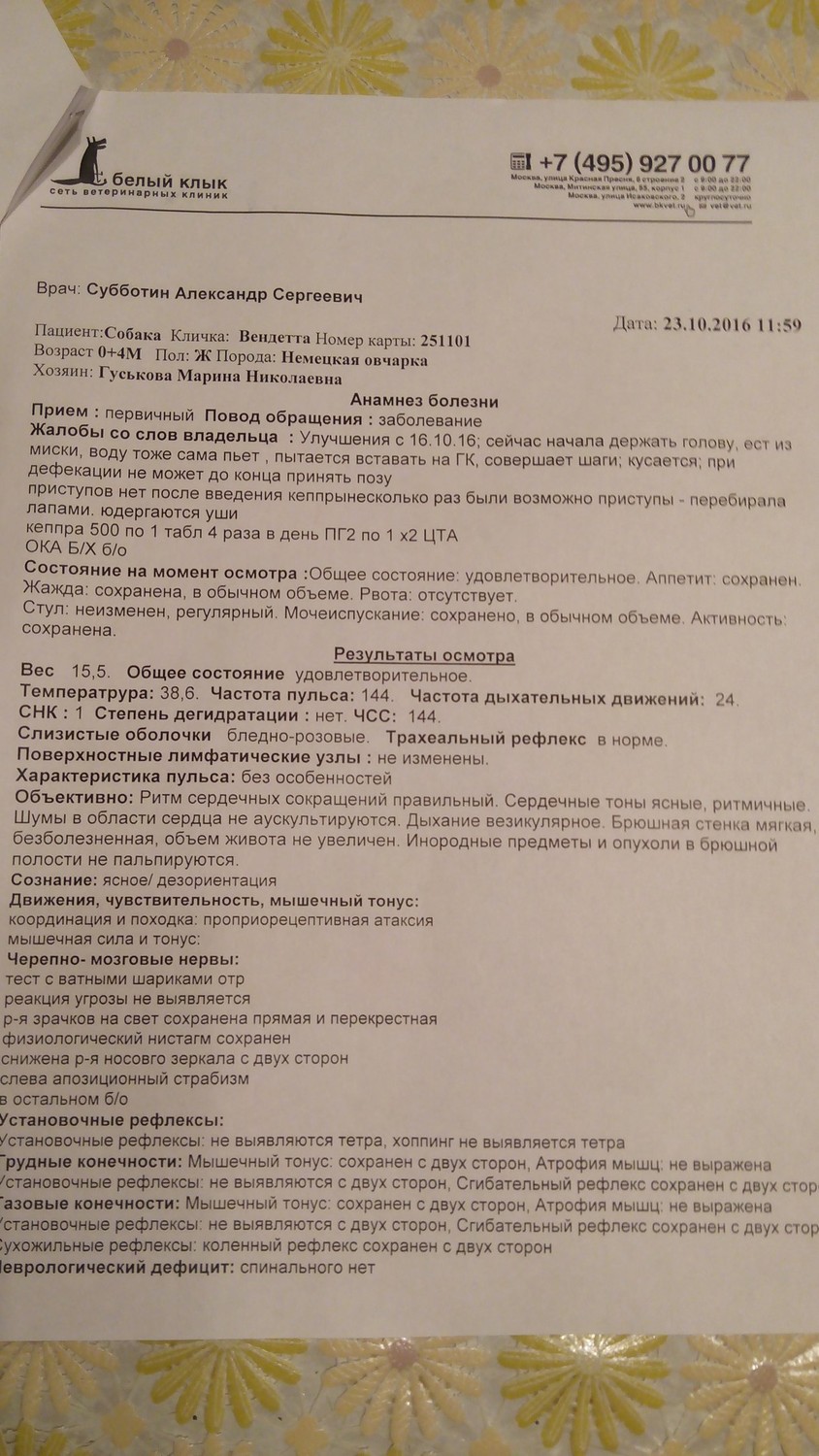 Всем добрый вечер! У нас есть приятные новости! Мы сегодня были на повторном приеме у доктора Субботин А.С. в клинике Белый клык. Доехали отлично, малышка всю дорогу играла с мячиком, чесала об него зубки. Увидев нас, доктор даже заулыбался, от того, что увидел положительную динамику. Щенулька слышит, реагирует, пытается вставать на ГК, совершает шаги, кусается. Глазки он тоже посмотрел, ничего очень страшного он не увидел. Сказал, что для восстановления зрения, может потребовать достаточно много времени. У нас прошла только неделя, как прекратились судороги. По его мнению, должно пройти около месяца, чтобы оценивать ситуацию а по зрению ещё дольше. Малышу ОЧЕНЬ нужна сейчас реабилитация в виде массажа, физиотерапии. Необходимо ставить её на лапки почаще, давать ей самой, без специальных средств, заново учится ходить. А у неё, кстати, получается. На специальном покрытии в клинике она сделала ЦЕЛЫХ ТРИ ШАГА , и доктор это видел. Да, задние лапки пока слабоваты, но прошла всего неделя. Он ставил её на лапки, она может стоять сама