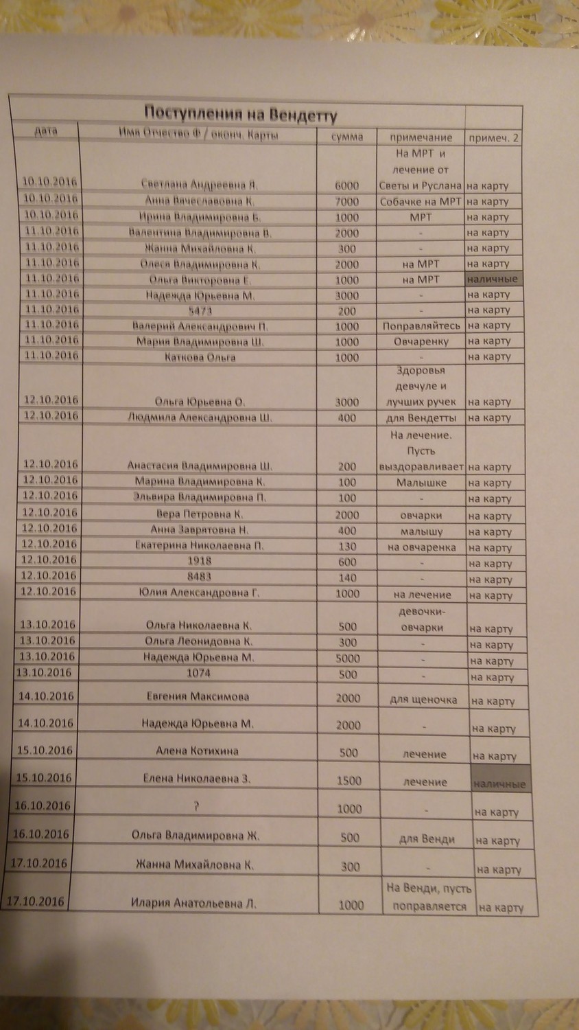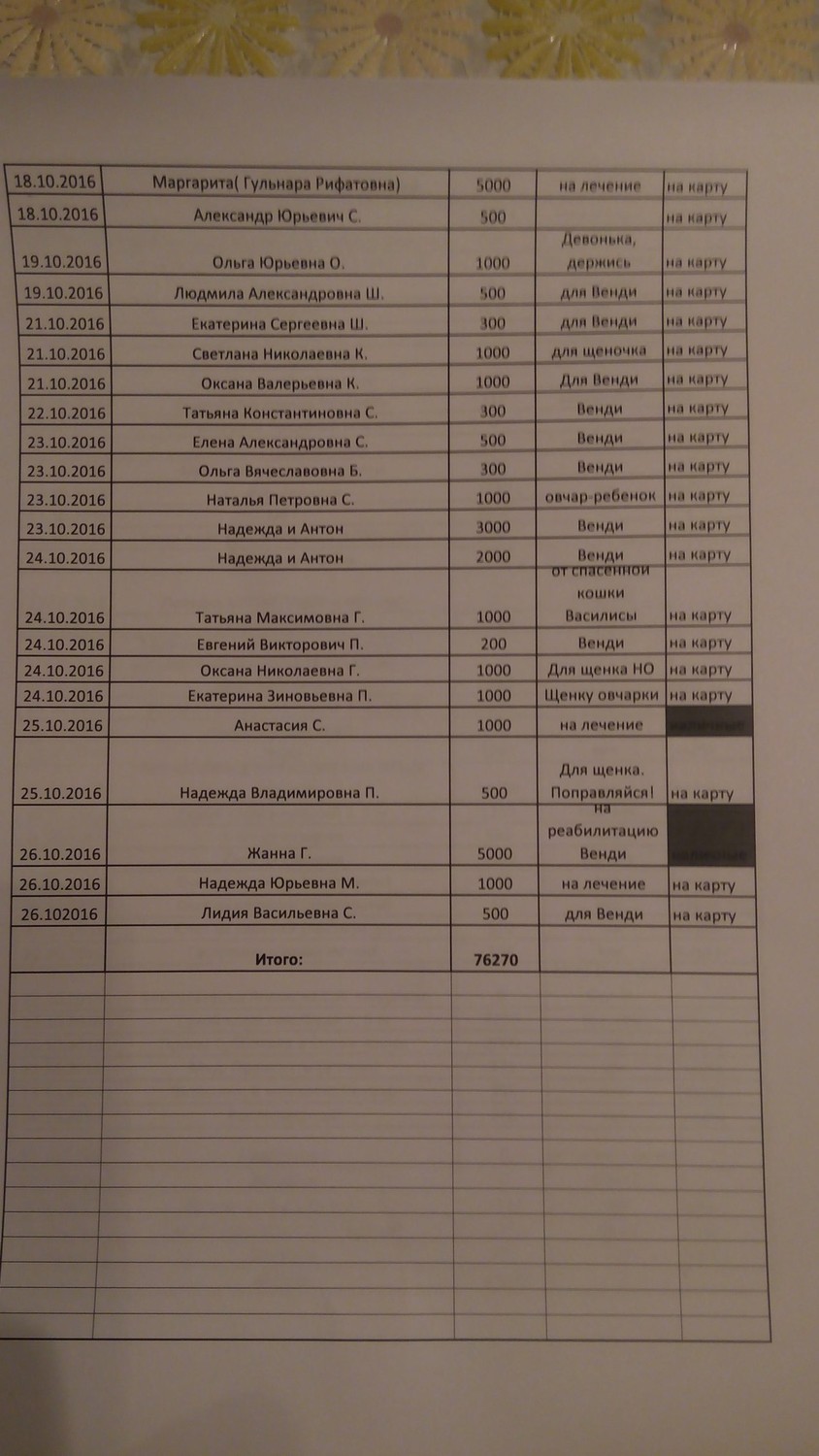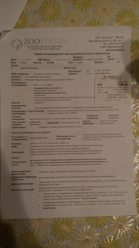 Добавлено (29.10.2016, 20:35) --------------------------------------------- Добрый вечер дорогие друзья! Сегодня Марина общалась с Субботиным. Показала видео с прогулки. Срочно нужен бассейн. Венди теряет мышцы. Уже обзвонили все, что можно. В Комондоре все есть, но нам там реабилитацию не потянуть, только первичное посещение с консультацией 7300. Далее 3100 одно занятие. Искали, где дешевле. Зоостатус. Там первичное 3500, далее 1500 разовое с сушкой щеночка после плавания. Выгоднее было бы приобрести абонемент на 20 посещений, стоит 24000. У нас остаток на сегодняшний день 16000. Нам чуточку не хватает. 27500- 16000= 11440. Сейчас пока берем консультацию и разовое посещение. $IMAGE1$