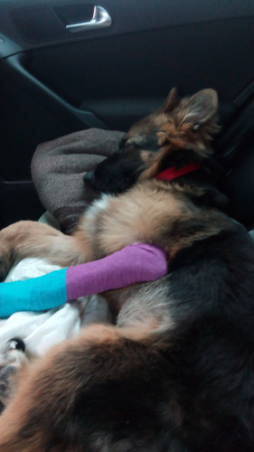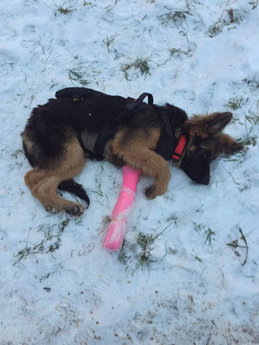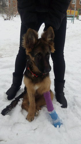 Добрый вечер, друзья! У Венди новая проблема . Вчера сделали рентген. По рентгену перелом на левой грудной конечности. Наложили лангету. Мы так расстроились, что вчера даже не смогли написать. Сегодня в срочном порядке поехали на консультацию к Ягникову в Ветпрофальянс. Выехали в шесть утра, были первые. Сделали ещё несколько снимков. Да, перелом н-предплечья по зоне роста подтвердился. Пока Венди лежала, он был не заметным, стала ходить - все усугубилось. Теперь в лангете нам ходить 14 дней. Каждые три дня смотреть, чтобы там не было опрелости. Вот такие дела. Бедная малышка. За что тебе все это, такие испытания? Спасибо огромное Назаровой Ольге за помощь! Она несколько раз в день приходит навещать Венди. Играет с ней, помогает делать массаж. Сегодня встала ни свет, ни заря, чтобы отвезти нас к ортопеду. Огромная ей благодарность! Также, спасибо всем, кто нас поддерживает, помогает, интересуется и переживает! Вместе мы СИЛА! Причина не ясна, к сожалению. Может подскальзовалась. А косточки хрупкие. У меня она точно не падала. Везде резиновые дорожки. На травке только гуляем по снежку. Вот сама голову ломаю. Пьем витамины кальциум и Гелакан. Миленькая моя, как же ей тяжело. Детство проходит под препаратами, в темноте, да ещё и в лангете. БОЖЕ, услышь нас. ПОМОГИ! С Субботиным на связи, поэтому вся терапия под контролем невролога. Как только разрешит, будем снижать дозы. Мы все хотим, чтобы она побыстрее радовалась, виляла хвостиком, бегала... и т. д. Чтобы ощутила все прелести щенячьей жизни (играла, шкодила и охранять пока никого не надо, и защищать , а просто наслаждаться. Все тискают, целуют, любят... Она очень красивая!