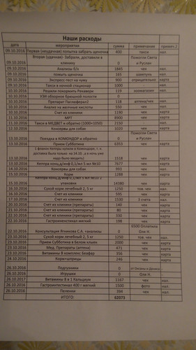 Добавлено (29.10.2016, 00:31) --------------------------------------------- Доброй ночи! Ребята я так горжусь Мариной и Олей, ведь не каждый человек на такое способен! Спасибо Боже, что мне повстречались такие люди! Мариночка выбрала время, которого катастрофически на всех не хватает, и составила отчет: Ещё заказала корм лечебный сухой на 5 т. р Пока врач сказал кормить гастроинтестиналом, т. к. было сильное воспаление ЖКТ. Вот какие мы сегодня красивые!