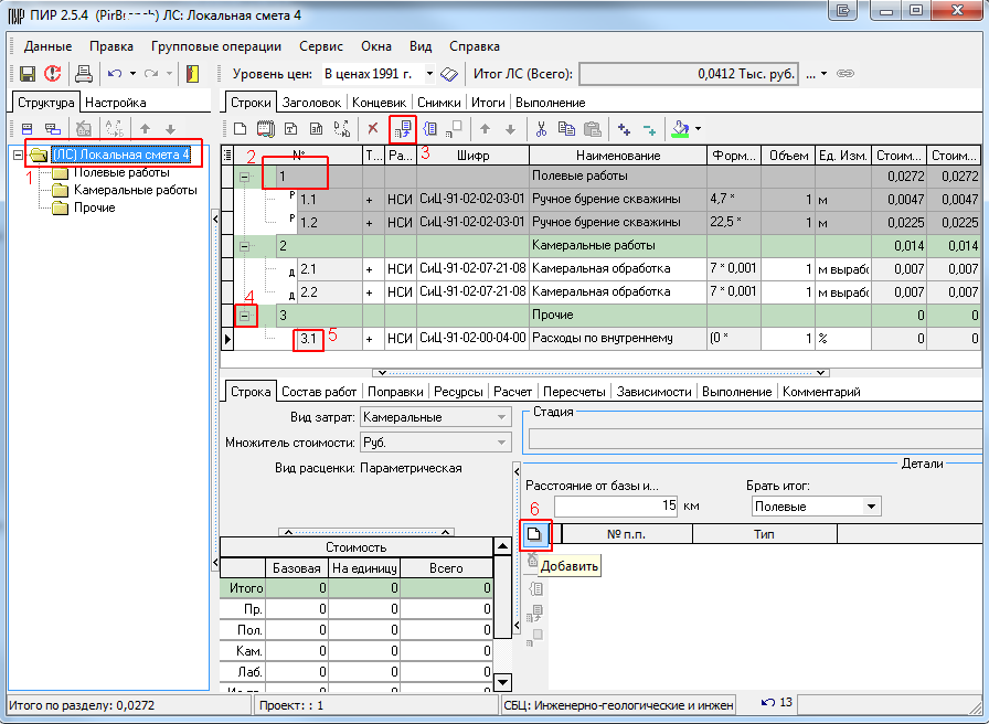 Встаньте на самый верхний узел в дереве (1) Справа будет показан список разделов сметы. Выделите нужный (2, 3). Раскройте плюсик на том разделе, где находится строка %-норма (4) Встаньте на нужную строку (5) Вставьте раздел в список зависимых (6).