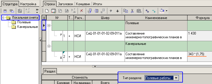 ASZ, чтобы применить эту поправку только к камеральным, вам надо создать в смете два раздела - один с типом "Полевые", а другой - "Камеральные". Тогда, если вы создаете строку, находясь в разделе типа "Полевые", то вам будет предложено "расщепить" строчку и создадутся две связанные строки (подробнее - смотрите в справке по системе, раздел "Методика расчета строки локальной сметы - Расчет стоимости изыскательских работ - Правила расчета итогов - Распределение стоимости изыскательских работ"). В этом случае, вы сможете применить поправку только к строке, находящейся в разделе типа "Камеральные".