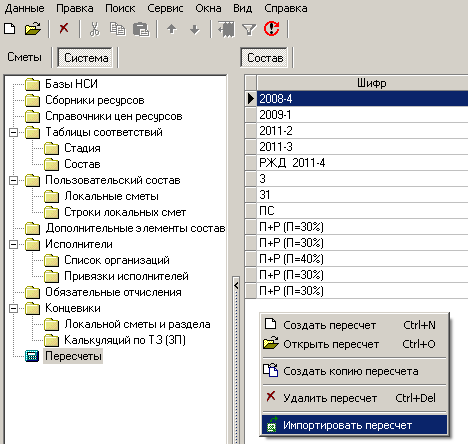 Для того, чтобы в программе появился пересчет, нужно его загрузить из прилагаемого файла Excel: - в главном окне системы переходите на вкладку "Система" и там выбираете "Пересчеты" - на списке пересчетов вызываете контекстное меню (правой кнопкой) - в этом меню выбираете пункт "Импортировать пересчет" (см. картинку) и выбираете нужный файл Excel.