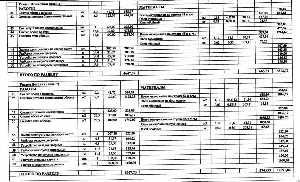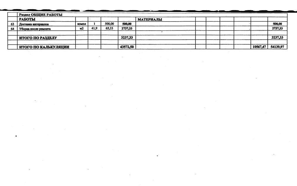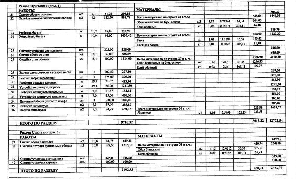 Добавлено (11.01.2013, 14:37) --------------------------------------------- Удивило несколько вещей: 1) п.18 зачем трогать радиатор? 2) п.34 угловой шкаф, с ним то что? 3) Ну и конечно цены, это просто смеху подобно, по таким ценам никто не сможет сделать этот ремонт. 4) С мебелью непонятно, ведь ее придется всю вытаскивать или перетаскивать, а в калькуляции это никак не отражено.