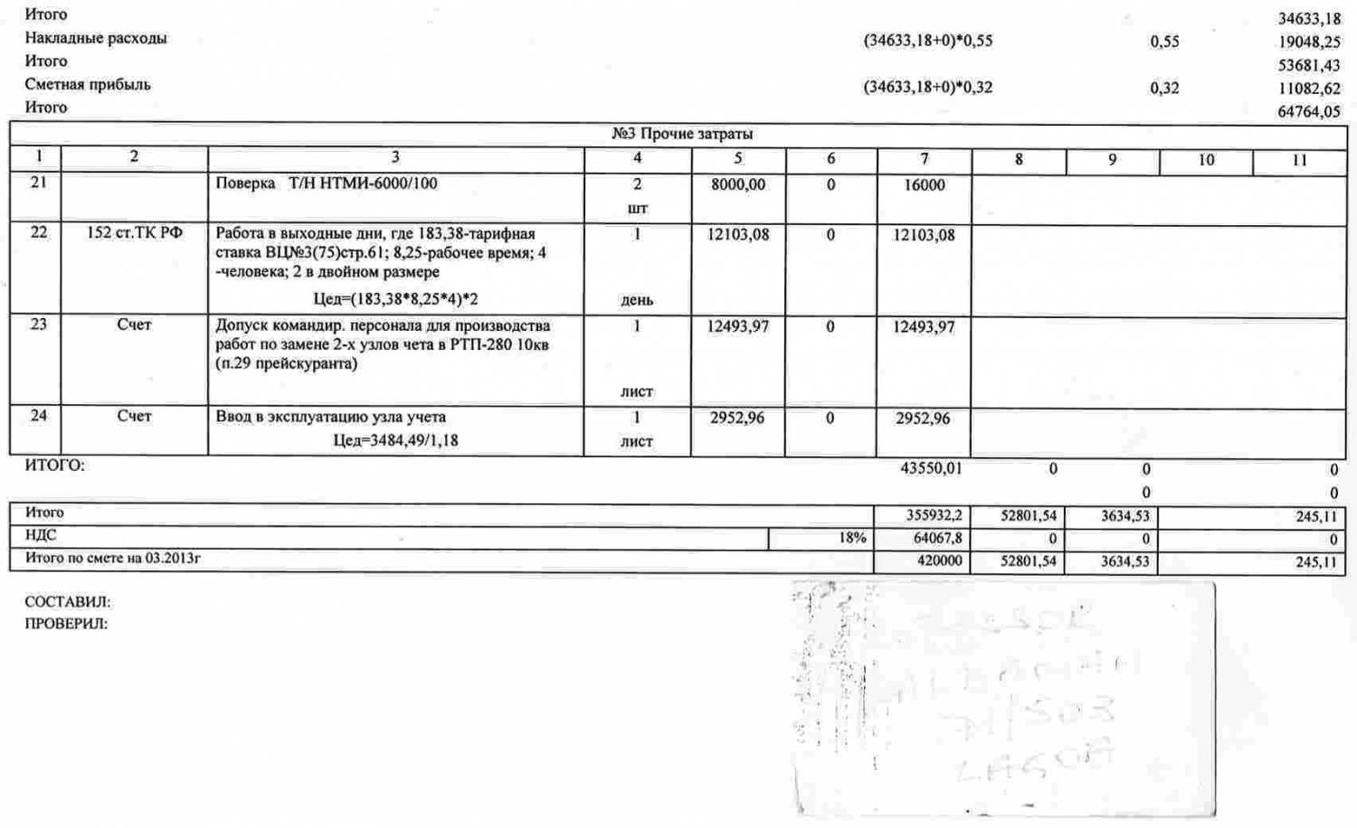 Спасибо за ответы dozor, Orlinka. А с допуском командированного персонала, как думаете я прав? И необходима ли поверка понижающих измерительных трансф-ов НТМИ-6000/100 (Прочие затарты п.21)?