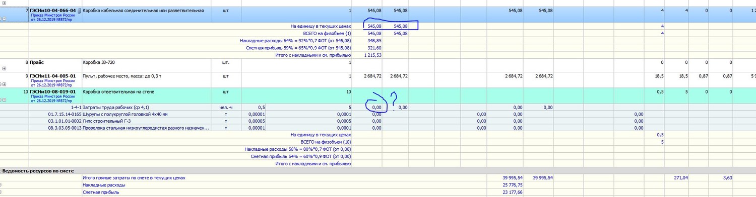 Посмотрите, пожалуйста, смету на замену элеватора. Не понимаю почему средства на оплату труда показывает 0?
