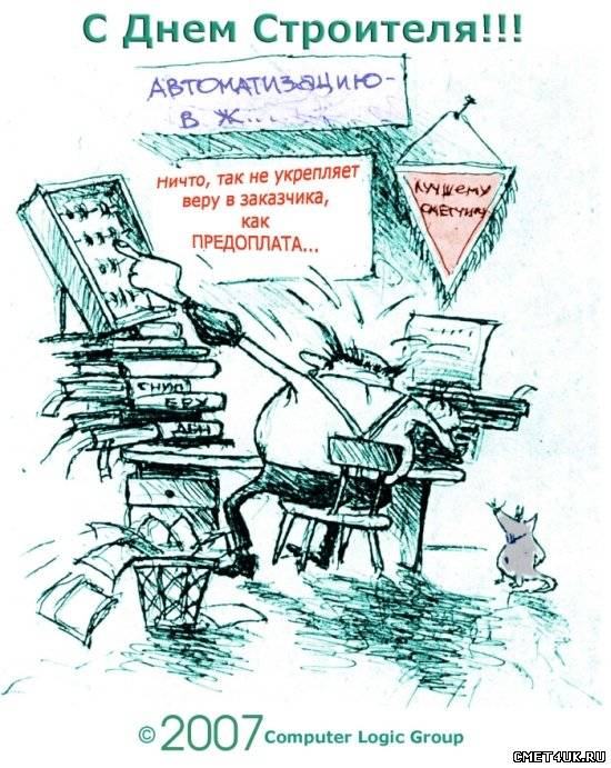 Поздравляю с наступающим Днем Строителя всех нас, молодых и не очень, умудренных опытом и только начинающих , линейных и офисных, студентов, нашедших прописку на данном форуме. Поздравляю гостей, неустанно следящих за чатом. Поздравляю оцифрованных гостей. Желаю всем хорошего здоровья, оптимизма, нормальных взаимоотношений на работе. Трудно подобрать слова, все уже сказано ранее. В заключение, просто для улыбки, монолог сметчицы-новичка