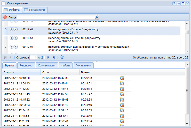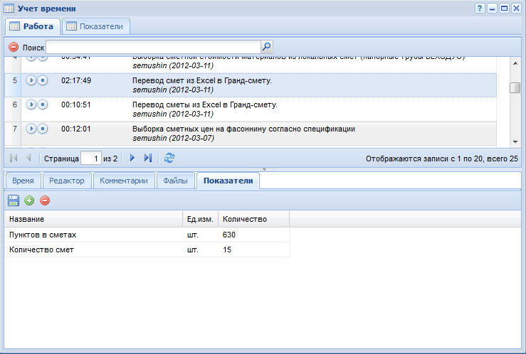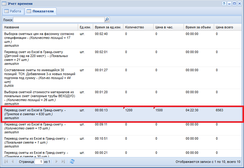 Короче.. сделал модуль по учёту времени http://b2barea.ru/desktop/ с возможностью выделения показателей выполненной работы. В результате по аналогу с выполненной работой можно просчитать сколько будет стоить текущая работа. Вот к примеру: Засёк работу "Перевод смет из Excel в Гранд-смету." Добавил показатель 630 расценок Итого работу выполнил за 2 часа 17 минут 49 секунд Автоматом просчиталось, что за 1 расценку перевожу за 13 секунд.