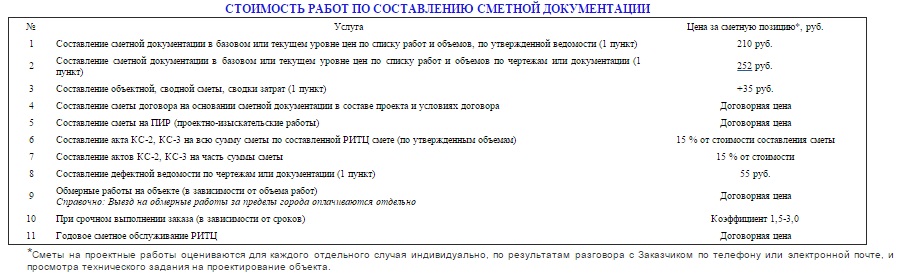 СТОИМОСТЬ РАБОТ ПО СОСТАВЛЕНИЮ СМЕТНОЙ ДОКУМЕНТАЦИИ