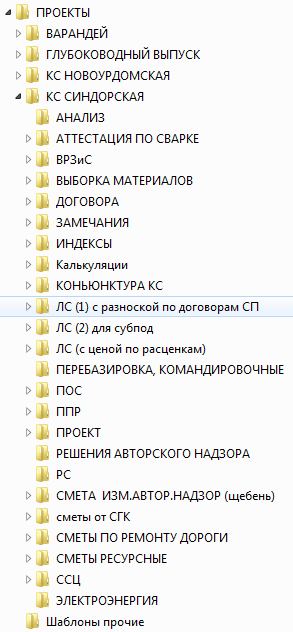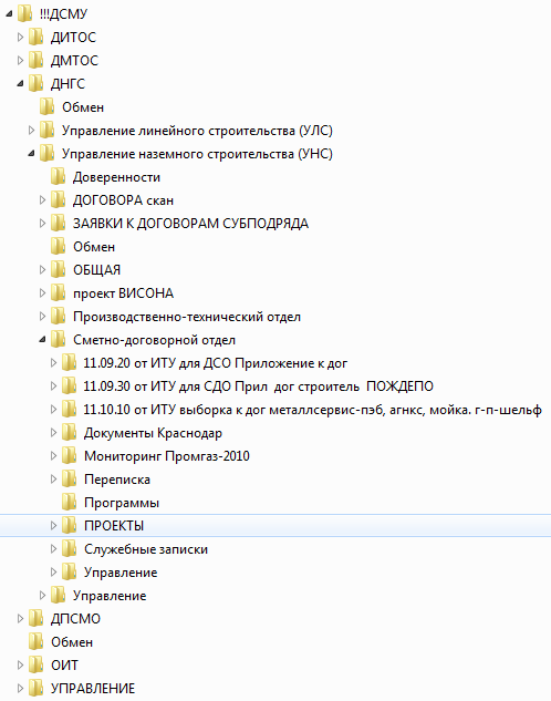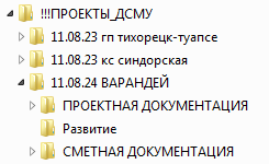 У меня на данный момент, происходить следующее, работаю по 3 направлениям, в независимых друг от друга фирмах. Начинаем с трех "папок" на рабочем столе, далее каждые разделены по трем различным направлениям, например: планируемые, в работе, исполненные (к отправке), каждая разделена еще на необходимые подгруппы, но стараюсь не разбивать последующие подгруппы больше трех. Кроме конечного. Например: "УЖК" разбито на: сметы, файлы к отправке, отработанные; файлы к отправке разбиты на даты: сегодня, вчера, позавчера ( в них периодически произвожу ротацию, по мере продвижения смет по проверке заказчиком), а в сегодня находятся файлы сметы с наименованиями адресов объектов, это может быть от 2 до 5 (в зависимости от тех или иных обстоятельств) и так по каждой конторе. Структура броде громоздкая, но скорость поиска файла необходимого высокая, для меня удобно, уже привык. Изначально трудно определиться с разбивкой, наименованиями, но в процессе работы выстраивается определенная структура. Предположим нет тебя на месте, любого человека можно "провести" по маршруту и получить требуемую информацию.