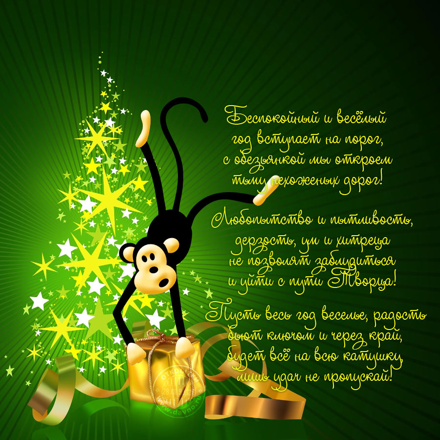 С Новым годом поздравляю! Обезьяна всех нас ждет, Пусть с хорошим настроением В каждый дом она войдет.