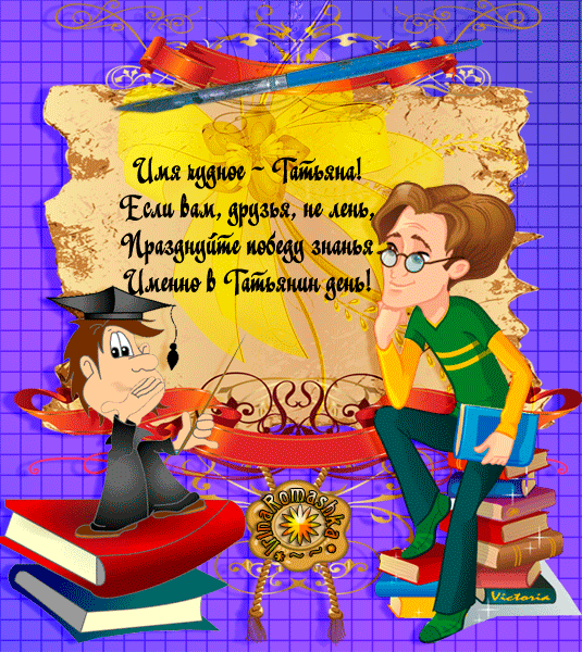 Тебя поздравить, Таня, есть у нас причина И пожелать тебе прекрасных, ярких дней, Татьянин день пришел, отметь же именины, В кругу родных своих, в кругу друзей. Желаем быть всегда в почете у начальства, Для подчиненных, Таня, будь авторитет, И даже если будет трудно, не печалься, Тебя умнее и красивей просто нет.