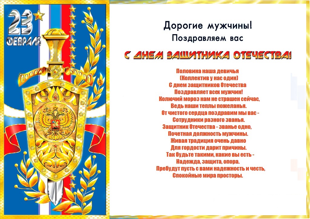 С 23 февраля Поздравляю вас, мужчины! Этот день календаря- Праздник мужества и силы Вам желаю от души Счастья, радости, удачи, Благосклонности судьбы И большой любви в придачу!