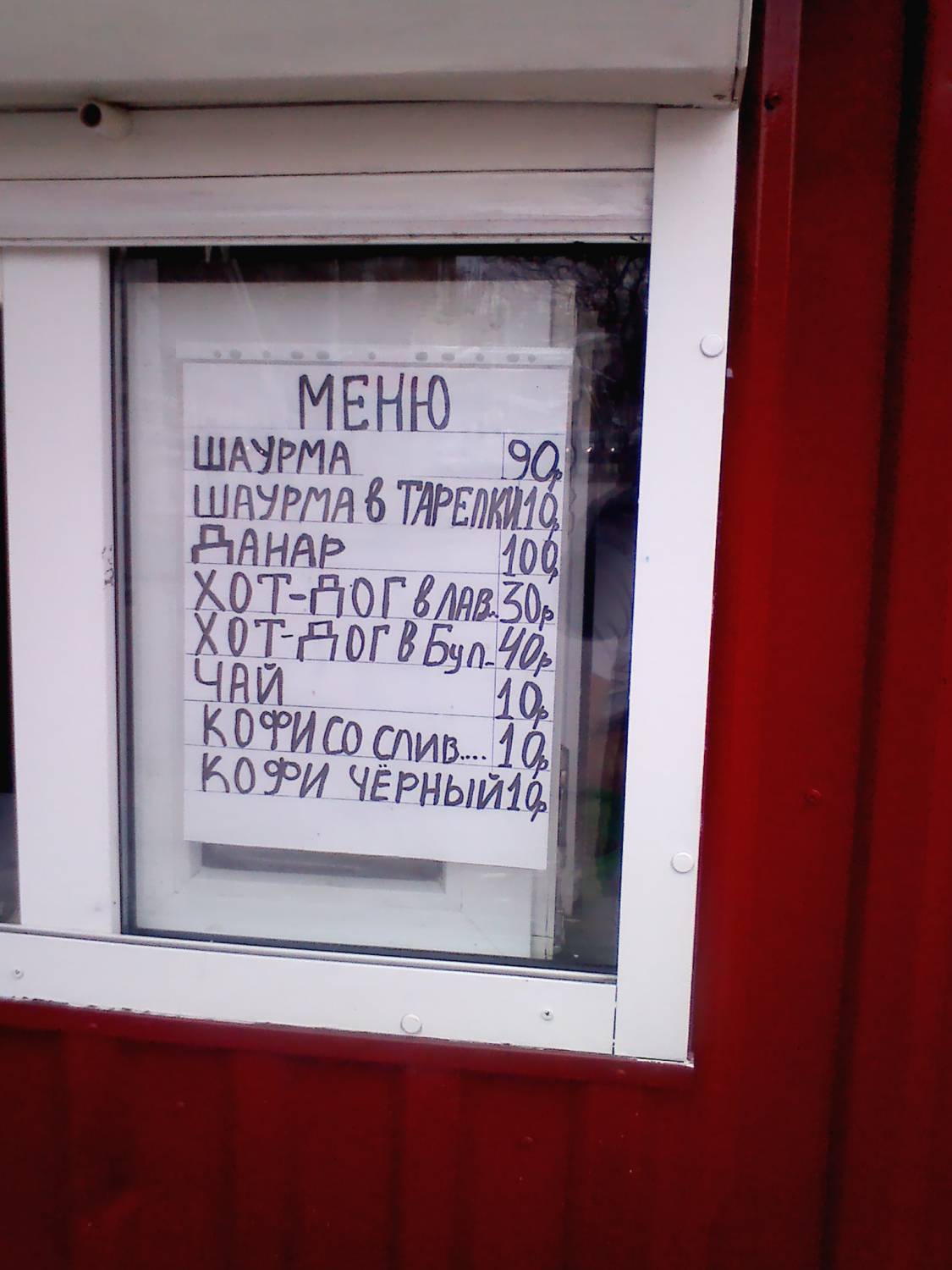 А это ларек, как раз по пути на мою работу... Турецкая шаурма на нем написано... Взгляд сразу уткнулся в меню, но... По прочтении сего меню заказывать что-то в нем не рискну