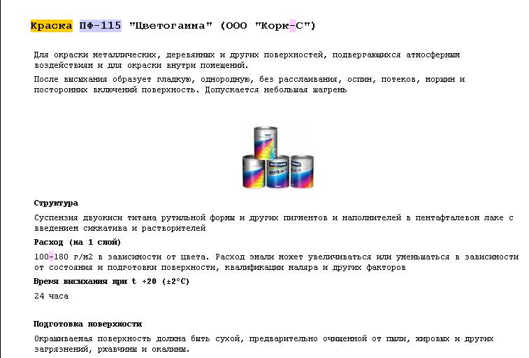 Вот меня (чисто из спортивного интереса) интересует краска ПФ-115 (есть просто расценка такая). Хотелось бы посмотреть какие есть производители и узнать характеристики. Научите пользоваться "фильтрацией". А? У меня при поиске (к сожалению отфильтровать ПФ-115 не смог) найдено в тексте документа 47 чего-то. Чего именно неизвестно. Делаю поиск "Краска ПФ-115" находится 9 совпадений открывается одна ссылка. Ага, делаю поиск "Эмаль ПФ-115". Уже ближе. Но тогда не находится краска. Они есть и краски и эмали. А слово эмаль встречается в описании каждой эмали по 10 раз. Кстати в списке материалов "Эмаль ПФ-115" встречается как минимум 2х местах. Может еще где есть, но лень было прощелкивать, т.к. 2й список длинный. (Могу подсказать что надо переделать чтобы работало).