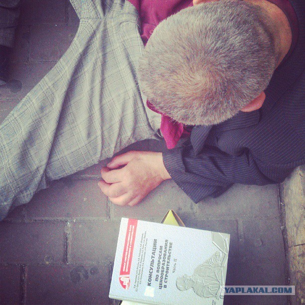 что человек просто шел мимо, а ему на голову упала сея книга...