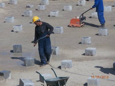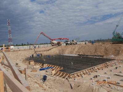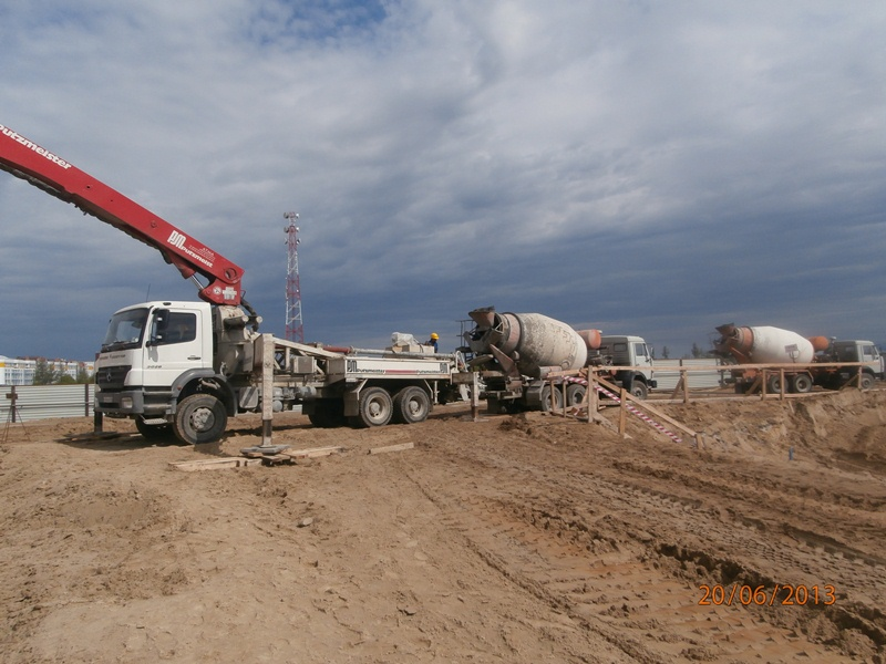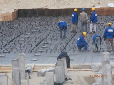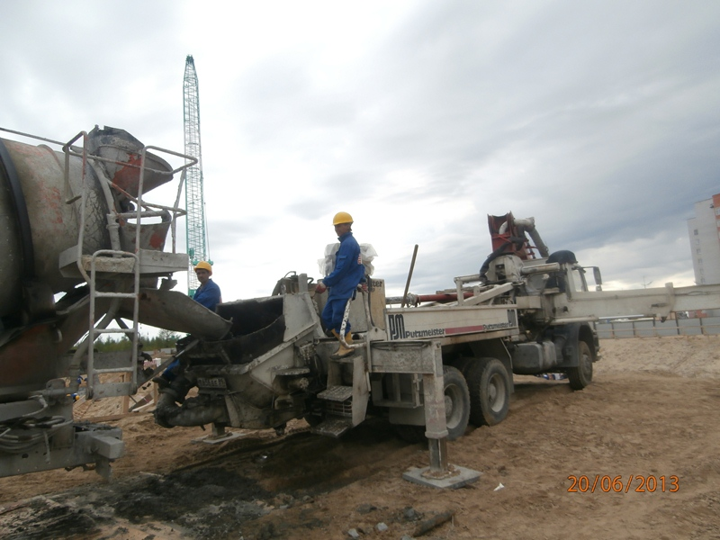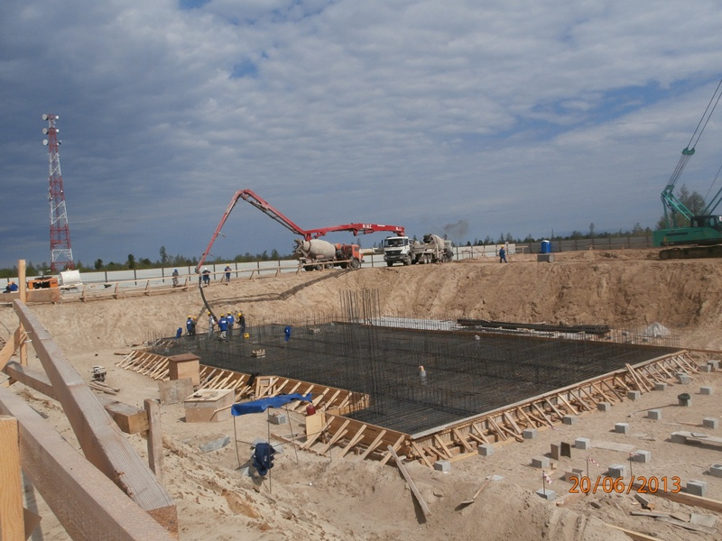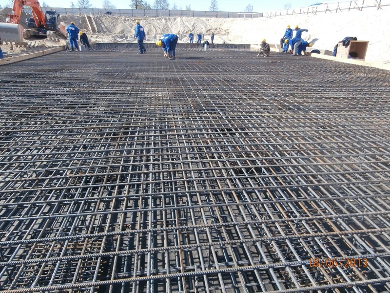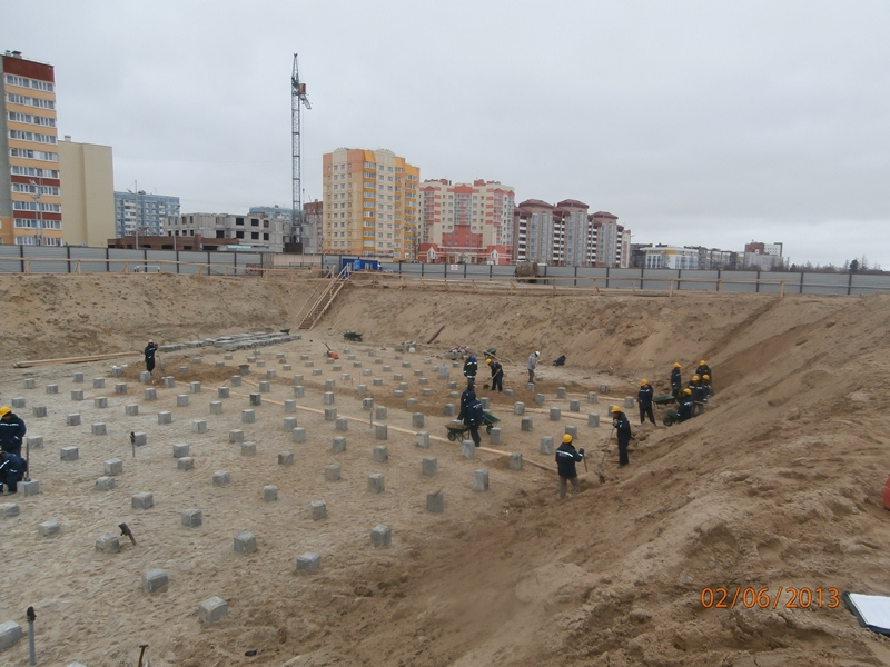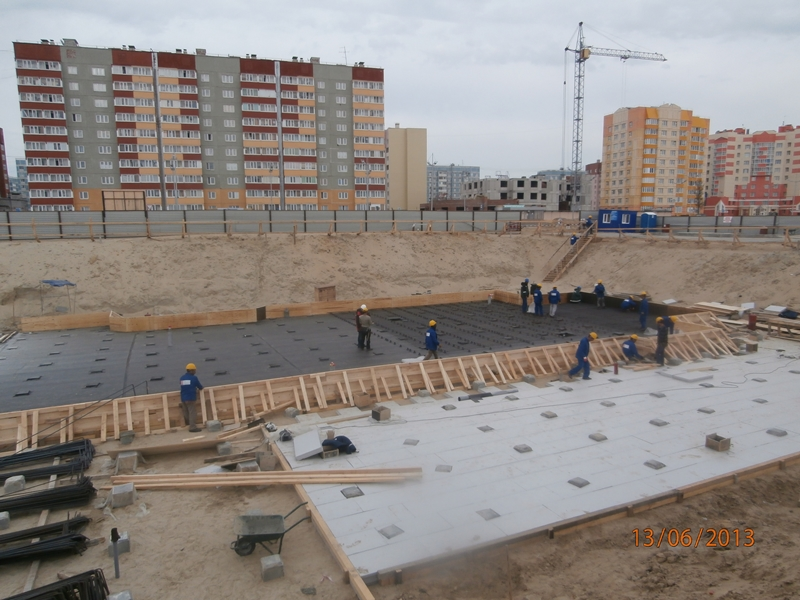 1. Убираем срубленные оголовки свай 2. Выравниваем площадку до проектной отметки 3. Огораживаем для опалубки 4. Поливка и уплотнение площадки 5. Укладка плит теплоизоляции 6. Прокладка гидроизоляционного слоя 7. Установка опалубки 8. Установка первого ряда арматуры с отступом по высоте для образования защитного слоя бетона 9. Установка арматуры 10. Заливка бетона бетононасосом
