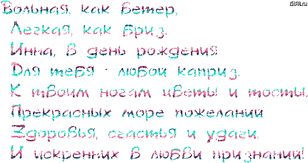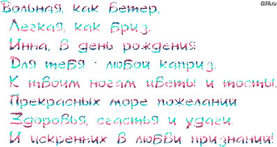 Инесса, дорогая! Поздравляю тебя с днём рождения! Сегодня твои «восемнадцать» настали. Уж мышцы окрепли, а нервы — из стали, А взгляд — он все тот же, из юности робкой, Как брызги шампанского в рюмочке с водкой.