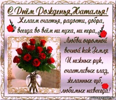 Фокси, Наташенька. Вот этот тортик с мягким сыром. Чтобы хватило нам на всех Чтоб муза сметная и с лирой. Благословляла на успех. Чтоб полоса лишь только белой Чтоб радуга в душе цвела И чтоб на фитнесе ты тело До совершенства довела Чтобы всегда с тобой по жизни Во всем сопутствовал успех Чтоб нет плохому даже в мыслях И чтобы радостный был смех.. С ДНЮШКОЙ. И ВСЕГО