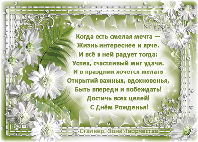zhu-zhu-zhu Веселого дня, настроенья хорошего Улыбок всегда и от верных друзей Сюрпризов приятных чтоб огорошили На тортике в меру горящих свечей. Поздравлений приятных, ласковых нежных Чтобы любая сбывалася блажь Ну и фантазий смелых, безбрежных. Да, а вареники мне все отдашь.. С ДНЮШКОЙ...И ВСЕГО