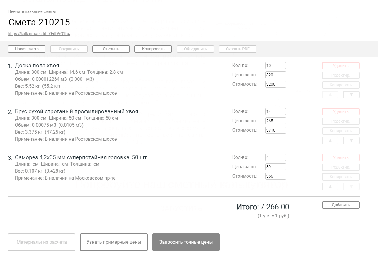 Что умеет наш сметный калькулятор, что не умеют большинство других? — импортировать данные непосредственно со строительных калькуляторов нашего сервиса (пока актуально только для крыш и лестниц) — рассчитывать стоимость материалов тремя способами (вручную по заданным значениям, по внутренним базам КАЛК.ПРО, напрямую по базам поставщиков) — отправлять заявки на материалы региональным компаниям прямо из интерфейса, т.е. вы нажимаете кнопку и расчет «разлетается» представителям местным магазинов, по строительным базам и т.д. А они в ответ на заявку, присылают вам на указанные контакты реальное предложение. Соответственно, вы можете выбрать лучшее. — присваивать каждой сохраненной смете уникальный УРЛ, который вы можете добавить в закладки или отправить коллегам