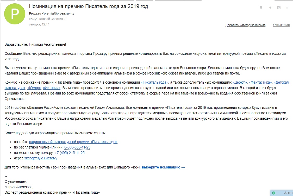 Innulya, Здравствуйте, Инесса. Возможно у Вас не открывается прикрепленный файл. В нем сообщение, что я номинирован на Национальную литературную премию "Писатель года - 1019".