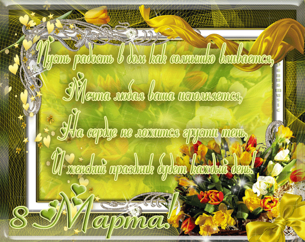 День сегодня особенный. Вы спросите: почему сегодня - ведь Праздник завтра? Потому, что завтра Вы дома, а сегодня Вы на работе: красивые (красивые вы всегда, но сегодня особенно!), слышите со всех сторон поздравления и самые добрые пожелания, а это только усиливает Ваше обаяние и привлекательность. Пусть сегодняшний день и будет особенным, пусть не покидает Вас отличное настроение, пусть праздник будет добрым и запоминающимся! От всей души - будьте здоровы и счастливы, любите и будьте любимыми, мира и счастья в Ваших семьях, здоровья и успехов Вашим детям, супругам и любимым. С Праздником, дорогие Женщины!