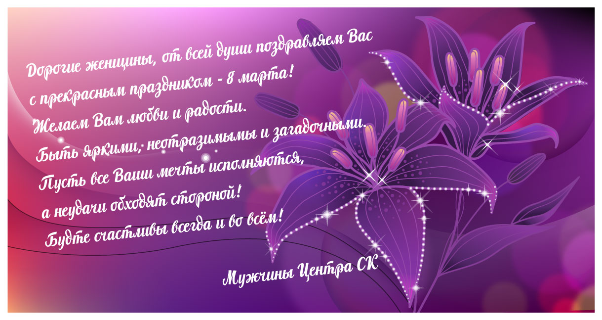 Всех милых Дам поздравляю с наступающим праздником! Что Женщине нужно на самом-то деле, Мы более-менее, вроде бы, знаем! И все, что себе пожелать вы хотели б - Мы именно этого вам и желаем!