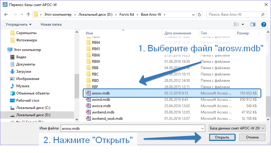 4. В открывшемся окне откройте папку с базой данных «АРОС-W» (пройдите по пути, который вы узнали в п.1) и выберите файл «aros.mdb».