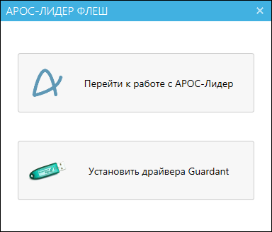 Новое в «АРОС-Лидер» версии Флеш: Меню запуска «АРОС-Лидер Флеш»: кнопка «Перейти к работе с АРОС-Лидер» - для запуска программы, кнопка «Установить драйверы Guardant» для установки драйвера электронного ключа.