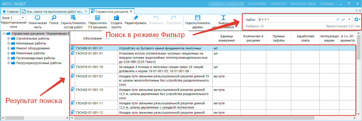 Добавлен поиск в режиме Фильтр, без открытия дополнительного диалогового окна. • Поиск выполняется сразу по короткому и полному наименованиям и обоснованию (коду) • Результаты поиска показываются сразу в окне справочника • В результаты поиска попадает первые 500 найденных строк. Если необходимо больше, то используйте окно «Поиск» • Панель поиска всегда расположена на верхней панели инструментов во всех справочниках программы • На ПК с несколькими ядрами в процессоре поиск в режиме Фильтр работает быстрее поиска через отдельное окно «Поиск». • Доступен в справочниках: -расценки -базовые материалы -базовые механизмы -кодификаторы -индексы -коэффициенты общей части (ранее поиска в справочнике не было) -коэффициенты демонтажа (ранее поиска в справочнике не было) -концовки (ранее поиска в справочнике не было)