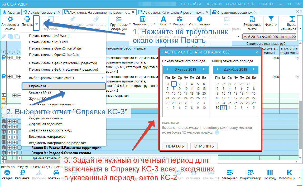 В ПК "АРОС-Лидер 2.0" есть возможность выбрать отчетный период в отчете КС-3, т.е. включить в КС-3 выбранный диапазон актов КС-2. 1. Сформируйте Акты КС-2 (один или несколько) 2. В открытой локальной смете нажмите на треугольник около кнопки Печать и выберите отчет "Справка КС-3" 3. В открывшемся окне настроек задайте нужный отчетный период для включения в Справку КС-3. 4. Нажмите кнопку Печатать. Сформируется отчет Справка КС-3 с учетом всех, входящих в указанный период актов КС-2.