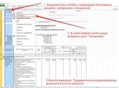 1) Откройте документ распечатанной сметы формата Excel (или любой другой документ, в котором содержится перечень обоснований расценок, материалов и/или механизмов) 2) В документе Excel выделите весь столбец, содержащий обоснования расценок, материалов и механизмов.