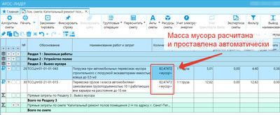 В "АРОС-Лидер 2.0" автоматический расчет массы Строительного мусора по смете.