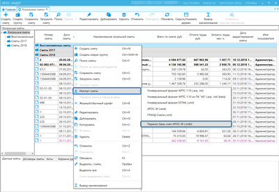 2. На главной закладке «АРОС-Лидер 2.0» нажмите «Локальные сметы». 3. В открывшемся окне нажмите правой кнопкой мыши и в появившемся меню выберите «Импорт сметы» - «Перенос базы смет АРОС-W (.mdb)»
